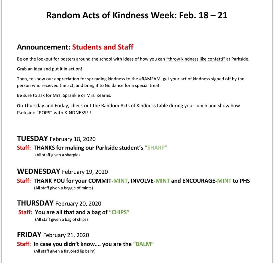 Parkside RAK week Posted bykindsbyMarch 10, 2020September 8, 2021Posted inActs of Kindness Mrs. Sprankle, Mrs. Kearns, and the PHS Guidance Department put on an amazing Random Acts of Kindness Week for the RAMFAM! Share this: Click to share on X (Opens in new window) X Click to share on Facebook (Opens in new window) Facebook Like Loading...