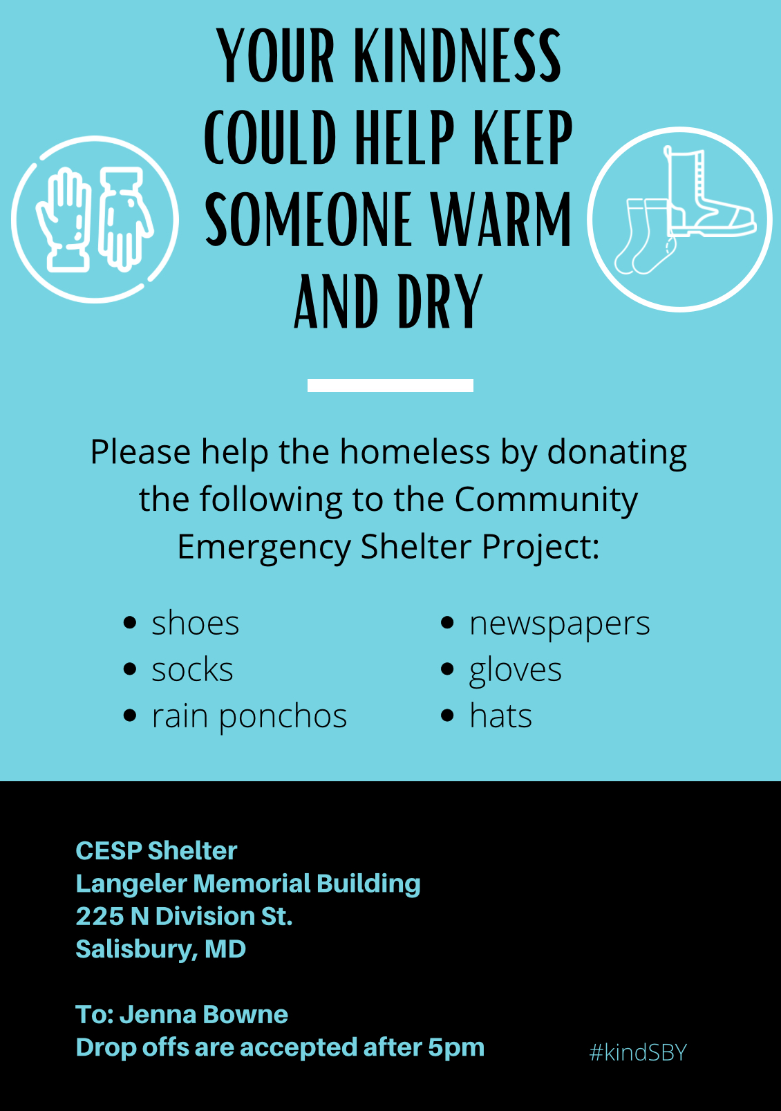 The CESP men’s shelter is in need of your support! They need donations of the following items: socks, shoes, hats, gloves, newspapers, and rain ponchos. Donations can be dropped off to the Langeler Memorial Building at 225 N. Division Street in Salisbury after 5pm daily to Jenna Bowne. They also need men volunteers for overnights: www.tinyurl.com/cespsignup and meals for 30 men, please sign up here: www.mealtrain.com/2y20d8. They are so grateful to everyone who has played a part ensuring that our homeless men don’t die outside this year.