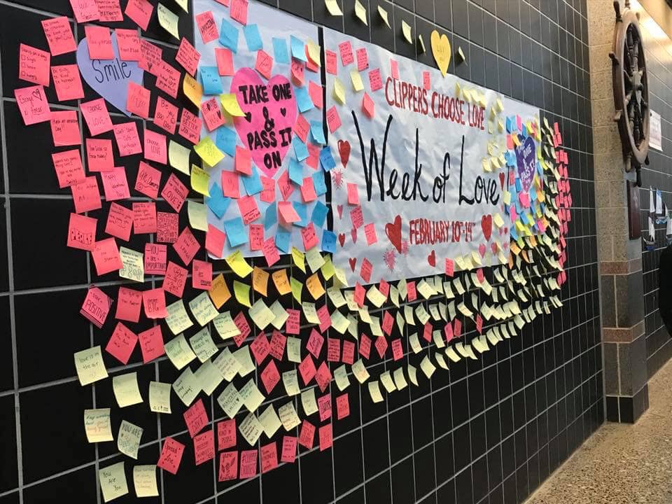 James M. Bennett High School highlighted kindness throughout their Clippers Choose Love week, that took place 2/10 – 2/14/20, by having an event where students could get advice on academics and more, encouraging students to tell someone if they loved them, creating cards for freshman students, taking a positive message from their post-it wall and passing it on and signing a banner to pledge that they would do an act of kindness.